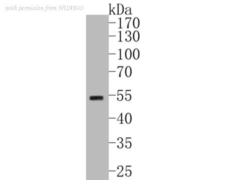 Western blot analysis of HNF-4-alpha on HepG2 cell lysates with Rabbit anti-HNF-4-alpha antibody (HA721006) at 1/500 dilution. Lysates/proteins at 10 µg/Lane. Predicted band size: 53 kDa Observed band size: 53 kDa Exposure time: 30 seconds; 10% SDS-PAGE gel. Proteins were transferred to a PVDF membrane and blocked with 5% NFDM/TBST for 1 hour at room temperature. The primary antibody (HA721006) at 1/500 dilution was used in 5% NFDM/TBST at room temperature for 2 hours. Goat Anti-Rabbit IgG - HRP Secondary Antibody (HA1001) at 1:200,000 dilution was used for 1 hour at room temperature.
