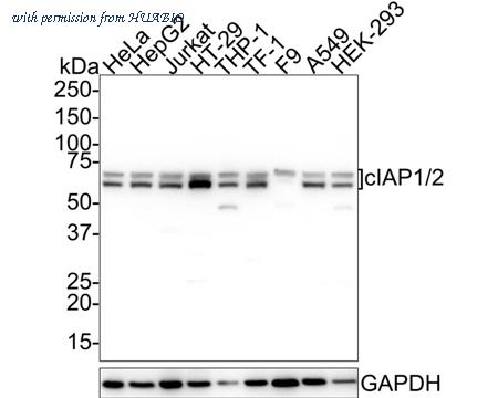 Western blot analysis of cIAP1/2 on different lysates with Rabbit anti-cIAP1/2 antibody (HA500535) at 1/1,000 dilution. Lane 1: HeLa cell lysate Lane 2: HepG2 cell lysate Lane 3: Jurkat cell lysate Lane 4: HT-29 cell lysate Lane 5: THP-1 cell lysate Lane 6: TF-1 cell lysate Lane 7: F9 cell lysate Lane 8: A549 cell lysate Lane 9: HEK-293 cell lysate Lysates/proteins at 20 µg/Lane. Predicted band size: 70/68 kDa Observed band size: 70/68 kDa Exposure time: 43 seconds; 4-20% SDS-PAGE gel. Proteins were transferred to a PVDF membrane and blocked with 5% NFDM/TBST for 1 hour at room temperature. The primary antibody (HA500535) at 1/1,000 dilution was used in 5% NFDM/TBST at room temperature for 2 hours. Goat Anti-Rabbit IgG - HRP Secondary Antibody (HA1001) at 1/50,000 dilution was used for 1 hour at room temperature.