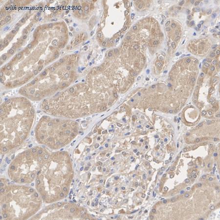 Immunohistochemical analysis of paraffin-embedded human kidney tissue with Rabbit anti-cIAP1/2 antibody (HA500535) at 1/200 dilution. The section was pre-treated using heat mediated antigen retrieval with Tris-EDTA buffer (pH 9.0) for 20 minutes. The tissues were blocked in 1% BSA for 20 minutes at room temperature, washed with ddH2O and PBS, and then probed with the primary antibody (HA500535) at 1/200 dilution for 1 hour at room temperature. The detection was performed using an HRP conjugated compact polymer system. DAB was used as the chromogen. Tissues were counterstained with hematoxylin and mounted with DPX.