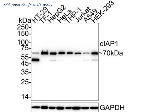 Western blot analysis of cIAP1 on different lysates with Rabbit anti-cIAP1 antibody (HA750780) at 1/2,000 dilution. Lane 1: HT-29 cell lysate Lane 2: TF-1 cell lysate Lane 3: HepG2 cell lysate Lane 4: HeLa cell lysate Lane 5: THP-1 cell lysate Lane 6: Jurkat cell lysate Lane 7: A549 cell lysate Lane 8: HEK-293 cell lysate Lysates/proteins at 20 µg/Lane. Predicted band size: 70 kDa Observed band size: 70 kDa Exposure time: 2 minutes; ECL: K1801; 4-20% SDS-PAGE gel. Proteins were transferred to a PVDF membrane and blocked with 5% NFDM/TBST for 1 hour at room temperature. The primary antibody (HA750780) at 1/2,000 dilution was used in 5% NFDM/TBST at 4℃ overnight. Goat Anti-Rabbit IgG - HRP Secondary Antibody (HA1001) at 1/50,000 dilution was used for 1 hour at room temperature.