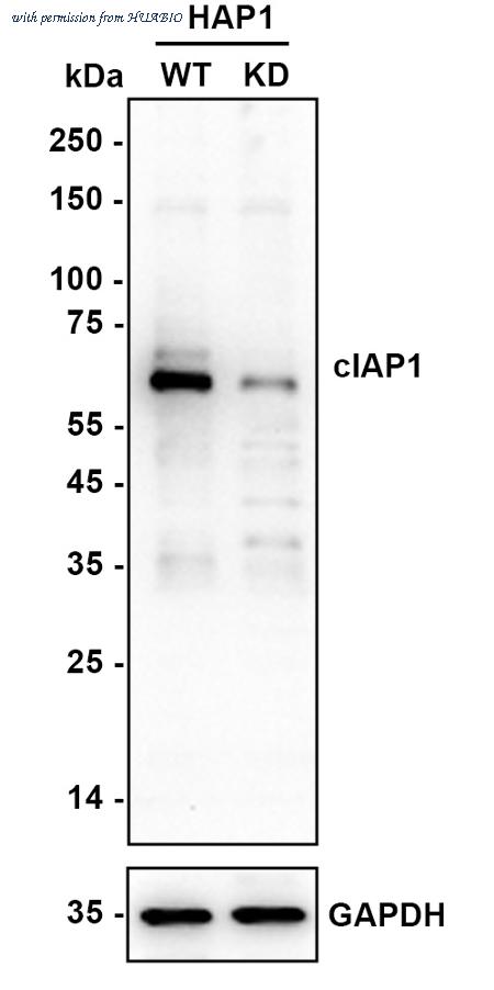 Western blot analysis of cIAP1 on different lysates with Rabbit anti-cIAP1 antibody (HA750780) at 1/2,000 dilution. Lane 1: HAP1-parental cell lysate Lane 2: HAP1-cIAP1 KD cell lysate Lysates/proteins at 10 µg/Lane. Predicted band size: 70 kDa Observed band size: 70 kDa Exposure time: 78 seconds; ECL: K1801; 4-20% SDS-PAGE gel. Proteins were transferred to a PVDF membrane and blocked with 5% NFDM/TBST for 1 hour at room temperature. The primary antibody (HA750780) at 1/2,000 dilution was used in K1803 at 4℃ overnight. Goat Anti-Rabbit IgG - HRP Secondary Antibody (HA1001) at 1/50,000 dilution was used for 1 hour at room temperature.