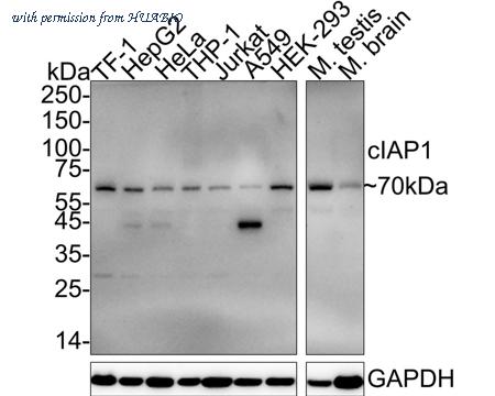 Western blot analysis of cIAP1 on different lysates with Rabbit anti-cIAP1 antibody (HA751101) at 1/2,000 dilution. Lane 1: TF-1 cell lysate (20 µg/Lane) Lane 2: HepG2 cell lysate (20 µg/Lane) Lane 3: HeLa cell lysate (20 µg/Lane) Lane 4: THP-1 cell lysate (20 µg/Lane) Lane 5: Jurkat cell lysate (20 µg/Lane) Lane 6: A549 cell lysate (20 µg/Lane) Lane 7: HEK-293 cell lysate (20 µg/Lane) Lane 8: Mouse testis tissue lysate (40 µg/Lane) Lane 9: Mouse brain tissue lysate (40 µg/Lane) Predicted band size: 70 kDa Observed band size: 70 kDa Exposure time: 3 minutes; ECL: K1802; 4-20% SDS-PAGE gel. Proteins were transferred to a PVDF membrane and blocked with 5% NFDM/TBST for 1 hour at room temperature. The primary antibody (HA751101) at 1/2,000 dilution was used in 5% NFDM/TBST at 4℃ overnight. Goat Anti-Rabbit IgG - HRP Secondary Antibody (HA1001) at 1/50,000 dilution was used for 1 hour at room temperature.