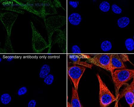 Immunocytochemistry analysis of HT-29 cells labeling cIAP1 with Rabbit anti-cIAP1 antibody (HA751101) at 1/100 dilution. Cells were fixed in 4% paraformaldehyde for 20 minutes at room temperature, permeabilized with 0.1% Triton X-100 in PBS for 5 minutes at room temperature, then blocked with 1% BSA in 10% negative goat serum for 1 hour at room temperature. Cells were then incubated with Rabbit anti-cIAP1 antibody (HA751101) at 1/100 dilution in 1% BSA in PBST overnight at 4 ℃. Goat Anti-Rabbit IgG H&L (iFluor™ 488, HA1121) was used as the secondary antibody at 1/1,000 dilution. PBS instead of the primary antibody was used as the secondary antibody only control. Nuclear DNA was labelled in blue with DAPI. Beta tubulin (M1305-2, red) was stained at 1/100 dilution overnight at +4℃. Goat Anti-Mouse IgG H&L (iFluor™ 594, HA1126) was used as the secondary antibody at 1/1,000 dilution.