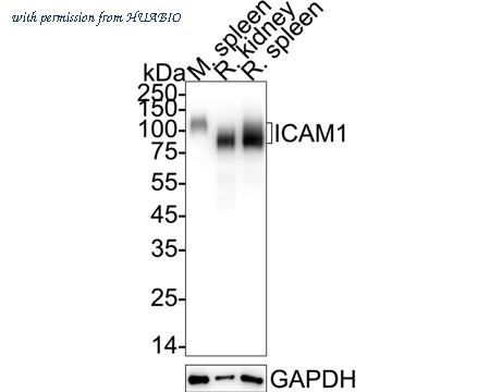 Western blot analysis of ICAM1 on different lysates with Rabbit anti-ICAM1 antibody (ER1910-98) at 1/5,000 dilution. Lane 1: Mouse spleen tissue lysate Lane 2: Rat kidney tissue lysate Lane 3: Rat spleen tissue lysate Lysates/proteins at 15 µg/Lane. Predicted band size: 60 kDa Observed band size: 75-120 kDa Exposure time: 4 seconds; ECL: K1801; 4-20% SDS-PAGE gel. Proteins were transferred to a PVDF membrane and blocked with 5% NFDM/TBST for 1 hour at room temperature. The primary antibody (ER1910-98) at 1/5,000 dilution was used in primary antibody dilution (K1803) at 4℃ overnight. Goat Anti-Rabbit IgG - HRP Secondary Antibody (HA1001) at 1/50,000 dilution was used for 1 hour at room temperature.