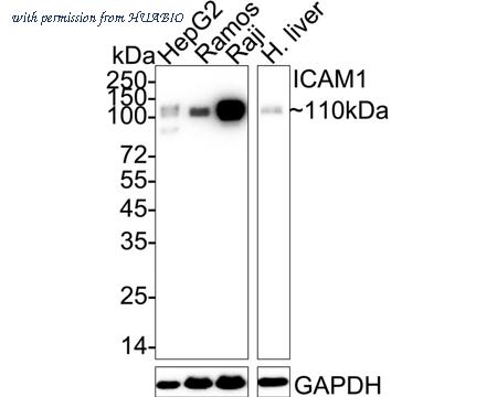 Western blot analysis of ICAM1 on different lysates with Rabbit anti-ICAM1 antibody (HA750176) at 1/1,000 dilution. Lane 1: HepG2 cell lysate (20 µg/Lane) Lane 2: Ramos cell lysate (20 µg/Lane) Lane 3: Raji cell lysate (20 µg/Lane) Lane 4: human liver tissue lysate (40 µg/Lane) Predicted band size: 58 kDa Observed band size: 110 kDa Exposure time: 25 seconds; ECL: K1801; 4-20% SDS-PAGE gel. Proteins were transferred to a PVDF membrane and blocked with 5% NFDM/TBST for 1 hour at room temperature. The primary antibody (HA750176) at 1/1,000 dilution was used in 5% NFDM/TBST at 4℃ overnight. Goat Anti-Rabbit IgG - HRP Secondary Antibody (HA1001) at 1/50,000 dilution was used for 1 hour at room temperature.