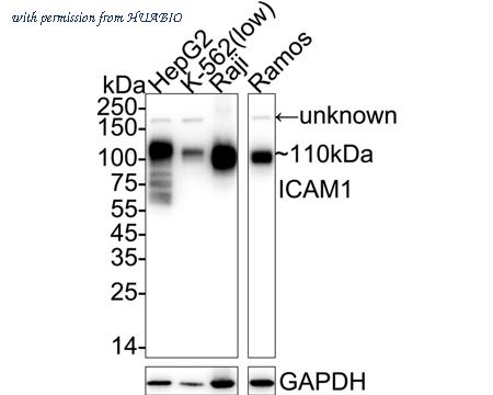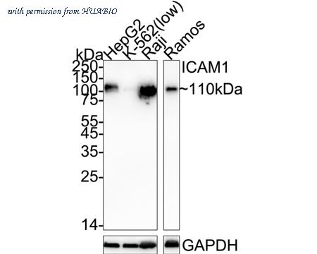 Western blot analysis of ICAM1 on different lysates with Rabbit anti-ICAM1 antibody (HA723089) at 1/5,000 dilution. Lane 1: HepG2 cell lysate Lane 2: K-562 cell lysate (low expression) Lane 3: Raji cell lysate Lane 4: Ramos cell lysate Lysates/proteins at 20 µg/Lane. Predicted band size: 58 kDa Observed band size: 110 kDa Exposure time: 10 seconds; ECL: K1801; 4-20% SDS-PAGE gel. Proteins were transferred to a PVDF membrane and blocked with 5% NFDM/TBST for 1 hour at room temperature. The primary antibody (HA723089) at 1/5,000 dilution was used in 5% NFDM/TBST at 4℃ overnight. Goat Anti-Rabbit IgG - HRP Secondary Antibody (HA1001) at 1/50,000 dilution was used for 1 hour at room temperature.