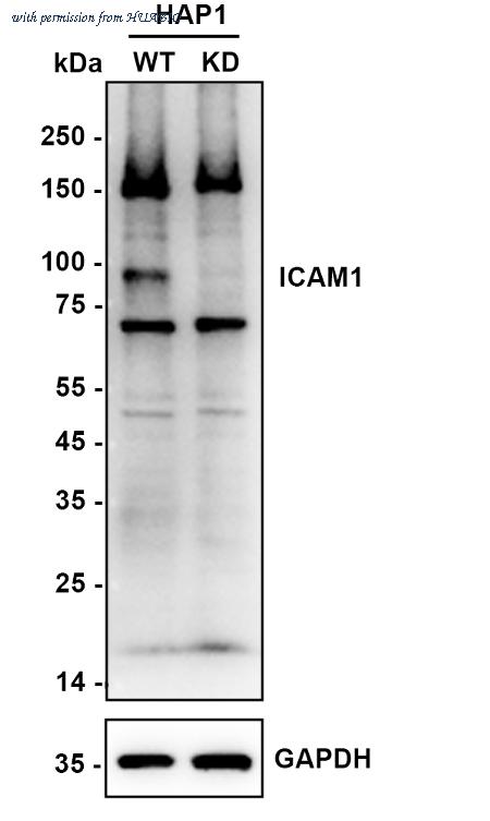 Western blot analysis of ICAM1 on different lysates with Mouse anti-ICAM1 antibody (M1505-7) at 1/1,000 dilution. Lane 1: HAP1-parental cell lysate Lane 2: HAP1-ICAM1 KD cell lysate Lysates/proteins at 10 µg/Lane. Predicted band size: 58 kDa Observed band size: 80 kDa Exposure time: 15 seconds; ECL: K1801; 4-20% SDS-PAGE gel. Proteins were transferred to a PVDF membrane and blocked with 5% NFDM/TBST for 1 hour at room temperature. The primary antibody (M1505-7) at 1/1,000 dilution was used in K1803 at 4℃ overnight. Goat Anti-Mouse IgG - HRP Secondary Antibody (HA1006) at 1/50,000 dilution was used for 1 hour at room temperature.