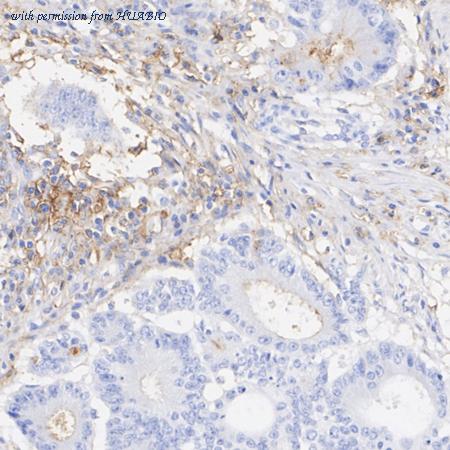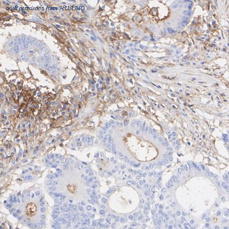 Immunohistochemical analysis of paraffin-embedded human colon cancer tissue with Rabbit anti-ICAM1 antibody (HA723089) at 1/8,000 dilution. The section was pre-treated using heat mediated antigen retrieval with Tris-EDTA buffer (pH 9.0) for 20 minutes. The tissues were blocked in 1% BSA for 20 minutes at room temperature, washed with ddH2O and PBS, and then probed with the primary antibody (HA723089) at 1/8,000 dilution for 1 hour at room temperature. The detection was performed using an HRP conjugated compact polymer system. DAB was used as the chromogen. Tissues were counterstained with hematoxylin and mounted with DPX.