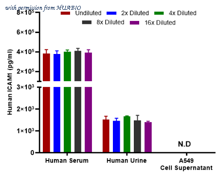 Interpolated concentrations of native ICAM1 in human samples. Interpolated concentration of native ICAM1 was measured in duplicate at different sample concentrations. Undiluted samples were 0.5% cell supernatant. The interpolated dilution factor corrected values were plotted (mean +/- SD, n=2). The mean ICAM1 concentration was determined to be 392,391 pg/mL in human serum and 1,501 pg/ml in human urine. There was no detectable signal in A549 cell culture supernatant.