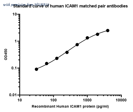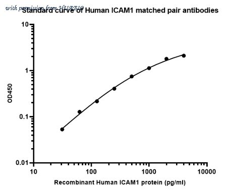 Sandwich ELISA analysis of Human ICAM1 matched pair antibodies Elisa assay was performed by coating wells of a 96-well plate with 100 µl per well of capture antibody (HA723184) diluted in carbonate/bicarbonate buffer, at a concentration of 5ug/ml overnight at 4℃. Wells of the plate were washed, blocked with 150 µl 0.05% tween-20 1% BSA blocking buffer, and incubated with serial diluted Recombinant Human ICAM1 protein (HA210857) starting from 4000 pg/ml to 0 pg/ml and detect antibody (HA723185, Biotin, 0.2 µg/ml) for 1 hour at 30℃ with shaking. Then the plate was washed and incubated with 100 µl per well of SA-HRP for 0.5 hour at 30℃ with shaking. Detection was performed using an Ultra TMB Substrate for 10 minutes at room temperature in the dark. The reaction was stopped with sulfuric acid and absorbances were read on a spectrophotometer at 450 nm.