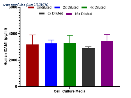 Interpolated concentrations of spiked ICAM1 in cell culture media samples. The concentrations of ICAM1 were measured in duplicates, interpolated from the ICAM1 standard curves and corrected for sample dilution. Undiluted samples are as follows: cell culture media 50%. The interpolated dilution factor corrected values are plotted (mean +/- SD, n=2).