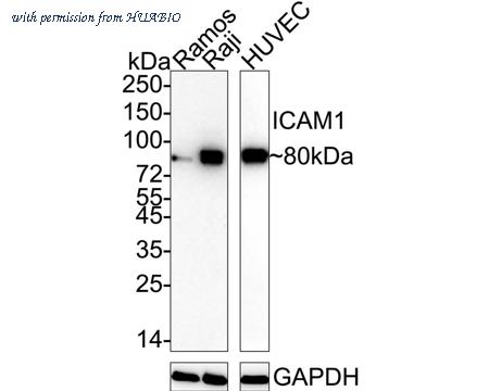 Western blot analysis of ICAM1 on different lysates with Mouse anti-ICAM1 antibody (M1505-7) at 1/1,000 dilution. Lane 1: Ramos cell lysate Lane 2: Raji cell lysate Lane 3: HUVEC cell lysate Lysates/proteins at 30 µg/Lane. Predicted band size: 58 kDa Observed band size: 80 kDa Exposure time: 2 minutes 30 seconds; ECL: K1801; 4-20% SDS-PAGE gel. Proteins were transferred to a PVDF membrane and blocked with 5% NFDM/TBST for 1 hour at room temperature. The primary antibody (M1505-7) at 1/1,000 dilution was used in 5% NFDM/TBST at 4℃ overnight. Goat Anti-Mouse IgG - HRP Secondary Antibody (HA1006) at 1/50,000 dilution was used for 1 hour at room temperature.
