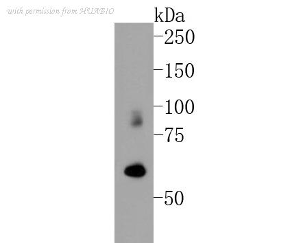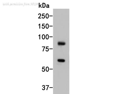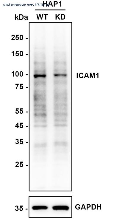 Western blot analysis of ICAM1 on different lysates with Rabbit anti-ICAM1 antibody (HA723089) at 1/10,000 dilution. Lane 1: HAP1-parental cell lysate Lane 2: HAP1-ICAM1 KD cell lysate Lysates/proteins at 10 µg/Lane. Predicted band size: 58 kDa Observed band size: 100 kDa Exposure time: 1 minute; ECL: K1801; 4-20% SDS-PAGE gel. Proteins were transferred to a PVDF membrane and blocked with 5% NFDM/TBST for 1 hour at room temperature. The primary antibody (HA723089) at 1/10,000 dilution was used in primary antibody dilution (K1803) at 4℃ overnight. Goat Anti-Rabbit IgG - HRP Secondary Antibody (HA1001) at 1/50,000 dilution was used for 1 hour at room temperature.