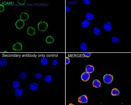 Immunocytochemistry analysis of Raji cells labeling ICAM1 with Mouse anti-ICAM1 antibody (M1505-7) at 1/100 dilution. Cells were fixed in 4% paraformaldehyde for 15 minutes at room temperature, permeabilized with 0.1% Triton X-100 in PBS for 15 minutes at room temperature, then blocked with 1% BSA in 10% negative goat serum for 1 hour at room temperature. Cells were then incubated with Mouse anti-ICAM1 antibody (M1505-7) at 1/100 dilution in 1% BSA in PBST overnight at 4 ℃. Goat Anti-Mouse IgG H&L (iFluor™ 488, HA1125) was used as the secondary antibody at 1/1,000 dilution. PBS instead of the primary antibody was used as the secondary antibody only control. Nuclear DNA was labelled in blue with DAPI. beta Tubulin (ET1602-4, red) was stained at 1/100 dilution overnight at +4℃. Goat Anti-Rabbit IgG H&L (iFluor™ 594, HA1122) were used as the secondary antibody at 1/1,000 dilution.