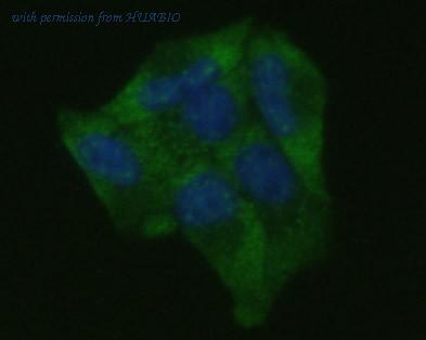 ICC staining of ICAM1 in Hela cells (green). Formalin fixed cells were permeabilized with 0.1% Triton X-100 in TBS for 10 minutes at room temperature and blocked with 1% Blocker BSA for 15 minutes at room temperature. Cells were probed with the primary antibody (M1511-6, 1/100) for 1 hour at room temperature, washed with PBS. Alexa Fluor®488 Goat anti-Mouse IgG was used as the secondary antibody at 1/1,000 dilution. The nuclear counter stain is DAPI (blue).