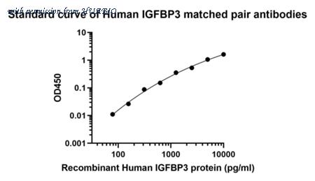 Sandwich ELISA analysis of human IGFBP3 matched pair antibodies Capture: HA723432, Human Leptin Rabbit mAb [PSH12-16] Detector: HA723433, Human Leptin Rabbit mAb [PSH12-17] Elisa assay was performed by coating wells of a 96-well plate with 50 µl per well of capture antibody (HA723432) diluted in carbonate/bicarbonate buffer, at a concentration of 2 µg/ml overnight at 4℃. Wells of the plate were washed, blocked with 150 µl 0.05% tween-20 1% BSA blocking buffer, and incubated with serial diluted Recombinant Human IGFBP3 protein (HA210585) starting from 4,000 pg/ml to 0 pg/ml and detect antibody (HA723433, Biotin, 0.05 µg/ml) for 1 hour at 30℃ with shaking. Then the plate was washed and incubated with 50 µl per well of SA-HRP for 0.5 hour at 30℃ with shaking. Detection was performed using an Ultra TMB Substrate for 10 minutes at room temperature in the dark. The reaction was stopped with sulfuric acid and absorbances were read on a spectrophotometer at 450 nm.