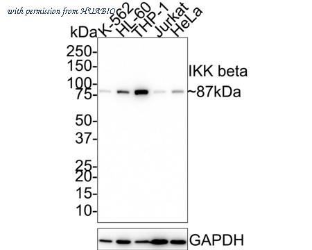 Western blot analysis of IKK beta on different lysates with Rabbit anti-IKK beta antibody (HA721715) at 1/1,000 dilution. Lane 1: K-562 cell lysate Lane 2: HL-60 cell lysate Lane 3: THP-1 cell lysate Lane 4: Jurkat cell lysate Lane 5: HeLa cell lysate Lysates/proteins at 20 µg/Lane. Predicted band size: 87 kDa Observed band size: 87 kDa Exposure time: 3 minutes; 4-20% SDS-PAGE gel. Proteins were transferred to a PVDF membrane and blocked with 5% NFDM/TBST for 1 hour at room temperature. The primary antibody (HA721715) at 1/1,000 dilution was used in 5% NFDM/TBST at room temperature for 2 hours. Goat Anti-Rabbit IgG - HRP Secondary Antibody (HA1001) at 1/50,000 dilution was used for 1 hour at room temperature.