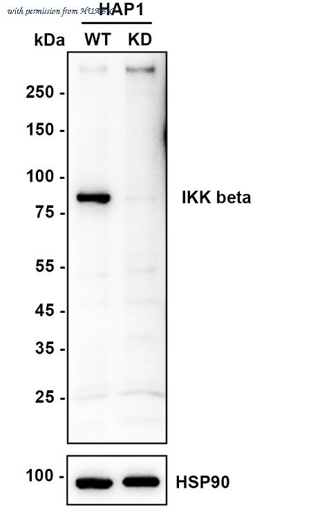 Western blot analysis of IKK beta on different lysates with Rabbit anti-IKK beta antibody (HA721715) at 1/2,000 dilution. Lane 1: HAP1-parental cell lysate Lane 2: HAP1-IKK beta KD cell lysate Lysates/proteins at 10 µg/Lane. Predicted band size: 87 kDa Observed band size: 87 kDa Exposure time: 40 seconds; ECL: K1801; 4-20% SDS-PAGE gel. Proteins were transferred to a PVDF membrane and blocked with 5% NFDM/TBST for 1 hour at room temperature. The primary antibody (HA721715) at 1/2,000 dilution was used in primary antibody dilution (K1803) at 4℃ overnight. Goat Anti-Rabbit IgG - HRP Secondary Antibody (HA1001) at 1/50,000 dilution was used for 1 hour at room temperature.