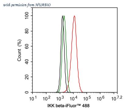 Flow cytometric analysis of THP-1 cells labeling IKK beta. Cells were fixed and permeabilized. Then stained with the primary antibody (HA721715, 1/50) (red) compared with Rabbit IgG Isotype Control (green). After incubation of the primary antibody at +4℃ for an hour, the cells were stained with a iFluor™ 488 conjugate-Goat anti-Rabbit IgG Secondary antibody (HA1121) at 1/1,000 dilution for 30 minutes at +4℃. Unlabelled sample was used as a control (cells without incubation with primary antibody; black).
