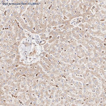 Immunohistochemical analysis of paraffin-embedded human liver tissue with Rabbit anti-IKK beta antibody (R1706-13) at 1/1,000 dilution. The section was pre-treated using heat mediated antigen retrieval with Tris-EDTA buffer (pH 9.0) for 20 minutes. The tissues were blocked in 1% BSA for 20 minutes at room temperature, washed with ddH2O and PBS, and then probed with the primary antibody (R1706-13) at 1/1,000 dilution for 1 hour at room temperature. The detection was performed using an HRP conjugated compact polymer system. DAB was used as the chromogen. Tissues were counterstained with hematoxylin and mounted with DPX.