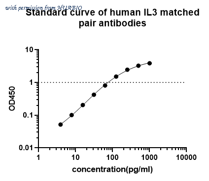 Standard curve of human IL-3 matched pair antibodies: Sandwich ELISA analysis of human IL-3 matched pair antibodies Elisa assay was performed by coating wells of a 96-well plate with 100 µl per well of capture antibody [PSH0-96] diluted in carbonate/bicarbonate buffer, at a concentration of 4 µg/mL overnight at 4℃. Wells of the plate were washed, blocked with 150 µl 0.05% tween-20 1%BSA blocking buffer, and incubated with serial diluted IL-3 protein starting from 2000 pg/ml to 0 pg/ml and detect antibody [PSH0-98]-Biotin (0.2 µg/ml) for 1 hour at 30℃ with shaking. Then the plate was washed and incubated with 100 µl per well of SA-HRP for 0.5 hour at 30℃ with shaking. Detection was performed using an Ultra TMB Substrate for 10 minutes at room temperature in the dark. The reaction was stopped with sulfuric acid and absorbances were read on a spectrophotometer at 450 nm.
