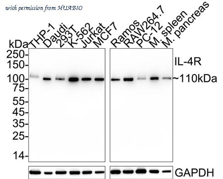Western blot analysis of IL-4R on different lysates with Rabbit anti-IL-4R antibody (HA723253) at 1/2,000 dilution. Lane 1: THP-1 cell lysate (20 µg/Lane) Lane 2: Daudi cell lysate (20 µg/Lane) Lane 3: 293T cell lysate (20 µg/Lane) Lane 4: K-562 cell lysate (20 µg/Lane) Lane 5: Jurkat cell lysate (20 µg/Lane) Lane 6: MCF7 cell lysate (20 µg/Lane) Lane 7: Ramos cell lysate (20 µg/Lane) Lane 8: RAW264.7 cell lysate (20 µg/Lane) Lane 9: PC-12 cell lysate (20 µg/Lane) Lane 10: Mouse spleen tissue lysate (40 µg/Lane) Lane 11: Mouse pancreas tissue lysate (40 µg/Lane) Predicted band size: 90 kDa Observed band size: 110 kDa Exposure time: 1 minute; ECL: K1801; 4-20% SDS-PAGE gel. Proteins were transferred to a PVDF membrane and blocked with 5% NFDM/TBST for 1 hour at room temperature. The primary antibody (HA723253) at 1/2,000 dilution was used in 5% NFDM/TBST at 4℃ overnight. Goat Anti-Rabbit IgG - HRP Secondary Antibody (HA1001) at 1/50,000 dilution was used for 1 hour at room temperature.