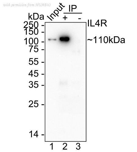 IL-4R was immunoprecipitated from 0.2 mg Jurkat cell lysate with HA723253 at 2 µg/10 µl beads. Western blot was performed from the immunoprecipitate using HA723253 at 1/1,000 dilution. HRP Conjugated Anti-Rabbit IgG for IP Nano-secondary antibody at 1/5,000 dilution was used for 1 hour at room temperature. Lane 1: Jurkat cell lysate (input) Lane 2: HA723253 IP in Jurkat cell lysate Lane 3: Rabbit IgG instead of HA723253 in Jurkat cell lysate Blocking/Dilution buffer: 5% NFDM/TBST Exposure time: 51 seconds; ECL: K1801