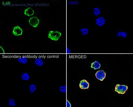 Immunocytochemistry analysis of PC-3M cells labeling IL-4R with Rabbit anti-IL-4R antibody (HA500453) at 1/100 dilution. Cells were fixed in 4% paraformaldehyde for 10 minutes at 37 ℃, permeabilized with 0.05% Triton X-100 in PBS for 20 minutes, and then blocked with 2% negative goat serum for 30 minutes at room temperature. Cells were then incubated with Rabbit anti-IL-4R antibody (HA500453) at 1/100 dilution in 2% negative goat serum overnight at 4 ℃. Goat Anti-Rabbit IgG H&L (iFluor™ 488, HA1121) was used as the secondary antibody at 1/1,000 dilution. PBS instead of the primary antibody was used as the secondary antibody only control. Nuclear DNA was labelled in blue with DAPI.