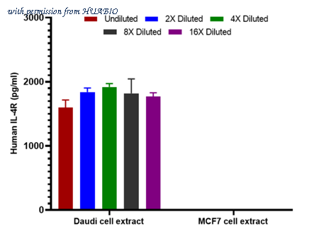 Interpolated concentrations of native IL-4R in Daudi and MCF7 extract samples based on a 1,000 µg/ml extract load. The concentrations of IL-4R were measured in duplicates, interpolated from the IL-4R standard curve and corrected for sample dilution. Undiluted samples are Daudi extract 100% and MCF7 extract 100%. The interpolated dilution factor corrected values are plotted (mean +/- SD, n=2). The mean IL-4R concentration was determined to be 1,789 pg/ml in Daudi extract and undetectable in MCF7 extract.