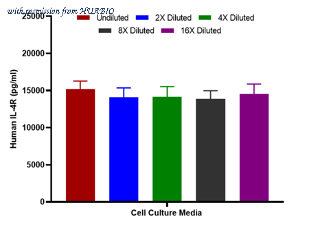 Interpolated concentrations of spiked IL-4R in human cell culture media samples. The concentrations of IL-4R were measured in duplicates, interpolated from the IL-4R standard curves and corrected for sample dilution. Undiluted samples are as follows: cell culture media 50%. The interpolated dilution factor corrected values are plotted (mean +/- SD, n=2).