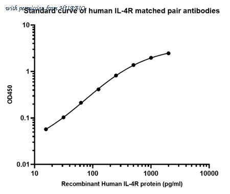 Sandwich ELISA analysis of human IL-4R matched pair antibodies Elisa assay was performed by coating wells of a 96-well plate with 50 µl per well of capture antibody (HA723336) diluted in carbonate/bicarbonate buffer, at a concentration of 5 µg/ml overnight at 4℃. Wells of the plate were washed, blocked with 150 µl 0.05% tween-20 1% BSA blocking buffer, and incubated with serial diluted Recombinant Human IL-4R protein (HA210720) starting from 2,000 pg/ml to 0 pg/ml and detect antibody (HA723337, Biotin, 0.5 µg/ml) for 1 hour at 30℃ with shaking. Then the plate was washed and incubated with 50 µl per well of SA-HRP for 0.5 hour at 30℃ with shaking. Detection was performed using an Ultra TMB Substrate for 10 minutes at room temperature in the dark. The reaction was stopped with sulfuric acid and absorbances were read on a spectrophotometer at 450 nm.