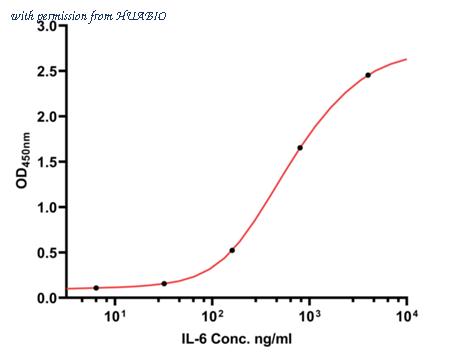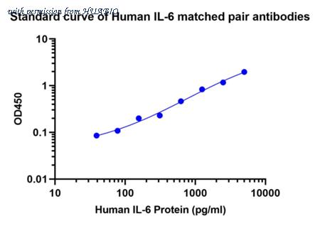 Dilute the Capture Antibody (HA721167) to the working concentration 5μg/ml in PBS without carrier protein. Immediately coat a 96-well microplate with 100 μL per well of the diluted Capture Antibody. Seal the plate and incubate overnight at 4℃. Aspirate each well and wash with Wash Buffer, repeating the process two times for a total of three washes. Add human IL6 protein (HA210797) with 1:1 serially diluted starting from a concentration of 5,000pg/ml and incubate 45 minutes at room temperature. Add 100 μL of the HRP-conjugated Detection Antibody (PS00-15) at a dilution of 0.2μg/ml to each well. Cover the plate and incubate for 30 minutes at room temperature. Add 50 μL of Stop Solution to each well. Determine the optical density of each well immediately, using a microplate reader set to 450 nm.