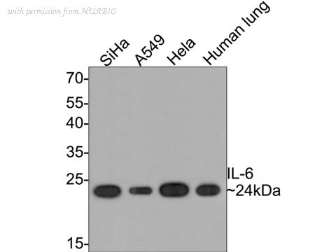 Western blot analysis of Human IL-6 on different lysates with Mouse anti-Human IL-6 antibody (HA601051) at 1/500 dilution. Lane 1: SiHa cell lysate Lane 2: A549 cell lysate Lane 3: Hela cell lysate Lane 4: Human lung tissue lysate (20 µg/Lane) Lysates/proteins at 10 µg/Lane. Predicted band size: 24 kDa Observed band size: 24 kDa Exposure time: 2 minutes; 12% SDS-PAGE gel. Proteins were transferred to a PVDF membrane and blocked with 5% NFDM/TBST for 1 hour at room temperature. The primary antibody (HA601051) at 1/500 dilution was used in 5% NFDM/TBST at room temperature for 2 hours. Goat Anti-Mouse IgG - HRP Secondary Antibody (HA1006) at 1:100,000 dilution was used for 1 hour at room temperature.