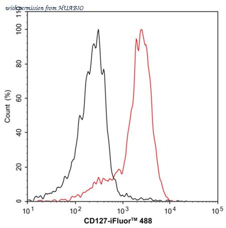 Flow cytometric analysis of human peripheral blood lymphocytes labeling CD127. Cells were washed twice with cold PBS and resuspend. Then stained with the primary antibody (HA601429, 1/1,000) (red). After incubation of the primary antibody at +4℃ for an hour, the cells were stained with a iFluor™ 488 conjugate-Goat anti-Mouse IgG Secondary antibody (HA1125) at 1/1,000 dilution for 30 minutes at +4℃. Unlabelled sample was used as a control (cells without incubation with primary antibody; black).