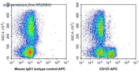 Flow cytometric analysis of human peripheral blood cells labeling CD127 (HA601536F, APC). Cells were washed twice with cold PBS and resuspend. Then incubated for 1 hour at +4℃ with CD127 (HA601536F, APC, 1/1,000) compared with Mouse IgG Isotype Control (APC, 1/1,000).
