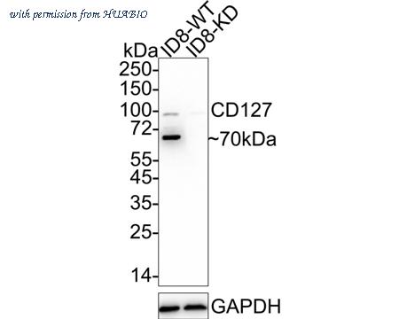 Western blot analysis of CD127 on different lysates with Rabbit anti-CD127 antibody (HA721214) at 1/1,000 dilution. Lane 1: ID8-si NT cell lysate Lane 2: ID8-si CD127 cell lysate Lysates/proteins at 10 µg/Lane. Predicted band size: 52 kDa Observed band size: 70 kDa Exposure time: 30 seconds; ECL: K1801; 4-20% SDS-PAGE gel. Proteins were transferred to a PVDF membrane and blocked with 5% NFDM/TBST for 1 hour at room temperature. The primary antibody (HA721214) at 1/1,000 dilution was used in 5% NFDM/TBST at 4℃ overnight. Goat Anti-Rabbit IgG - HRP Secondary Antibody (HA1001) at 1/50,000 dilution was used for 1 hour at room temperature.