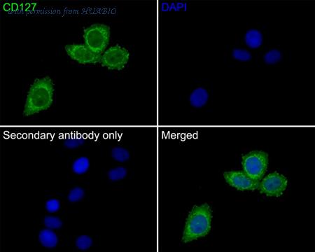 Immunocytochemistry analysis of SiHa cells labeling CD127 with Rabbit anti-CD127 antibody (HA721214) at 1/50 dilution. Cells were fixed in 4% paraformaldehyde for 10 minutes at 37 ℃, permeabilized with 0.05% Triton X-100 in PBS for 20 minutes, and then blocked with 2% negative goat serum for 30 minutes at room temperature. Cells were then incubated with Rabbit anti-CD127 antibody (HA721214) at 1/50 dilution in 2% negative goat serum overnight at 4 ℃. Goat Anti-Rabbit IgG H&L (iFluor™ 488, HA1121) was used as the secondary antibody at 1/1,000 dilution. PBS instead of the primary antibody was used as the secondary antibody only control. Nuclear DNA was labelled in blue with DAPI.