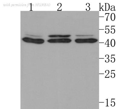 Western blot analysis of IL-10RB on different lysates with Rabbit anti-IL-10RB antibody (HA500322) at 1/500 dilution. Lane 1: 293T cell lysate Lane 2: Jurkat cell lysate Lane 3: Hela cell lysate Lysates/proteins at 10 µg/Lane. Predicted band size: 37 kDa Observed band size: 42 kDa (Glycoprotein) Exposure time: 2 minutes; 12% SDS-PAGE gel. Proteins were transferred to a PVDF membrane and blocked with 5% NFDM/TBST for 1 hour at room temperature. The primary antibody (HA500322) at 1/500 dilution was used in 5% NFDM/TBST at room temperature for 2 hours. Goat Anti-Rabbit IgG - HRP Secondary Antibody (HA1001) at 1:200,000 dilution was used for 1 hour at room temperature.