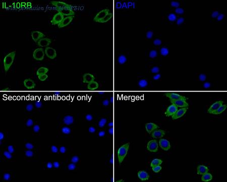 Immunocytochemistry analysis of SiHa cells labeling IL-10RB with Rabbit anti-IL-10RB antibody (HA500322) at 1/200 dilution. Cells were fixed in 4% paraformaldehyde for 10 minutes at 37 ℃, and then blocked with 2% negative goat serum for 30 minutes at room temperature. Cells were then incubated with Rabbit anti-IL-10RB antibody (HA500322) at 1/200 dilution in 2% negative goat serum overnight at 4 ℃. Goat Anti-Rabbit IgG H&L (Alexa Fluor® 488) was used as the secondary antibody at 1/1,000 dilution. PBS instead of the primary antibody was used as the secondary antibody only control. Nuclear DNA was labelled in blue with DAPI.