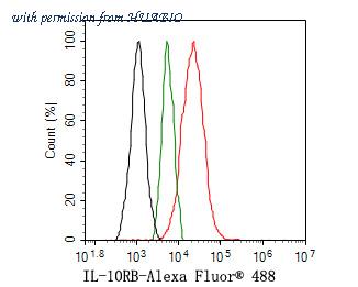 Flow cytometric analysis of THP-1 cells labeling IL-10RB. Cells were washed twice with cold PBS and resuspend. Then stained with the primary antibody (HA500322, 1ug/ml) (red) compared with Rabbit IgG Isotype Control (green). After incubation of the primary antibody at +4℃ for an hour, the cells were stained with a Alexa Fluor® 488 conjugate-Goat anti-Rabbit IgG Secondary antibody at 1/1,000 dilution for 30 minutes at +4℃. Unlabelled sample was used as a control (cells without incubation with primary antibody; black).