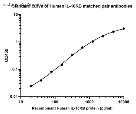 Sandwich ELISA analysis of Human IL-10RB matched pair antibodies Capture: HA725295, Human IL-10RB Rabbit mAb [PSH17-44] Detector: HA725296, Human IL-10RB Rabbit mAb [PSH17-45] Elisa assay was performed by coating wells of a 96-well plate with 50 µl per well of capture antibody HA725295 diluted in carbonate/bicarbonate buffer, at a concentration of 2 µg/ml overnight at 4℃. Wells of the plate were washed, blocked with 150 µl 0.05% tween-20 1% BSA blocking buffer, and incubated with serial diluted Recombinant Human IL-10RB (HA211205) protein starting from 10,000 pg/ml to 0 pg/ml and detect antibody (HA725296, Biotin, 0.2 µg/ml) for 1 hour at 30℃ with shaking. Then the plate was washed and incubated with 50 µl per well of SA-HRP for 0.5 hour at 30℃ with shaking. Detection was performed using an Ultra TMB Substrate for 10 minutes at room temperature in the dark. The reaction was stopped with sulfuric acid and absorbances were read on a spectrophotometer at 450 nm.