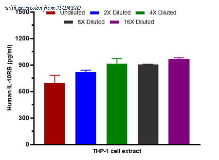 Interpolated concentrations of native IL-10RB in THP-1 cell extract: Capture: HA725295, Human IL-10RB Rabbit mAb [PSH17-44] Detector: HA725296, Human IL-10RB Rabbit mAb [PSH17-45] The concentrations of IL-10RB were measured in duplicates, interpolated from the IL-10RB standard curve and corrected for sample dilution. Undiluted samples are THP-1 cell extract 250 µg/mL. The interpolated dilution factor corrected values are plotted (mean +/- SD, n=2). The mean IL-10RB concentration was determined to be 861.6 pg/ml in THP-1 cell extract.