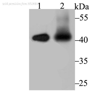 Western blot analysis of IL12B on different lysates. Proteins were transferred to a PVDF membrane and blocked with 5% BSA in PBS for 1 hour at room temperature. The primary antibody (ER1803-31, 1/500) was used in 5% BSA at room temperature for 2 hours. Goat Anti-Rabbit IgG - HRP Secondary Antibody (HA1001) at 1:5,000 dilution was used for 1 hour at room temperature. Positive control: Lane 1: Hela cell lysates Lane 2: Mouse placenta tissue lysates