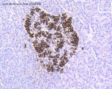 Immunohistochemical analysis of paraffin-embedded human pancreas tissue with Rabbit anti-Insulin B Chain antibody (0807-11) at 1/10,000 dilution. The section was pre-treated using heat mediated antigen retrieval with Tris-EDTA buffer (pH 9.0) for 20 minutes. The tissues were blocked in 1% BSA for 20 minutes at room temperature, washed with ddH2O and PBS, and then probed with the primary antibody (0807-11) at 1/10,000 dilution for 1 hour at room temperature. The detection was performed using an HRP conjugated compact polymer system. DAB was used as the chromogen. Tissues were counterstained with hematoxylin and mounted with DPX.