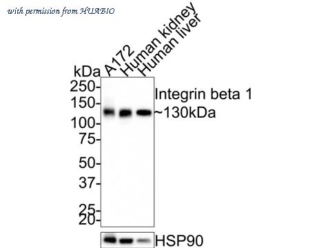 Western blot analysis of Integrin beta 1 on different lysates with Rabbit anti-Integrin beta 1 antibody (ER31001) at 1/1,000 dilution. Lane 1: A172 cell lysate Lane 2: Human kidney tissue lysate Lane 3: Human liver tissue lysate Lysates/proteins at 20 µg/Lane. Predicted band size: 88 kDa Observed band size: 130 kDa Exposure time: 13 seconds; 4-20% SDS-PAGE gel. Proteins were transferred to a PVDF membrane and blocked with 5% NFDM/TBST for 1 hour at room temperature. The primary antibody (ER31001) at 1/1,000 dilution was used in 5% NFDM/TBST at room temperature for 2 hours. Goat Anti-Rabbit IgG - HRP Secondary Antibody (HA1001) at 1:100,000 dilution was used for 1 hour at room temperature.