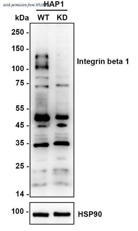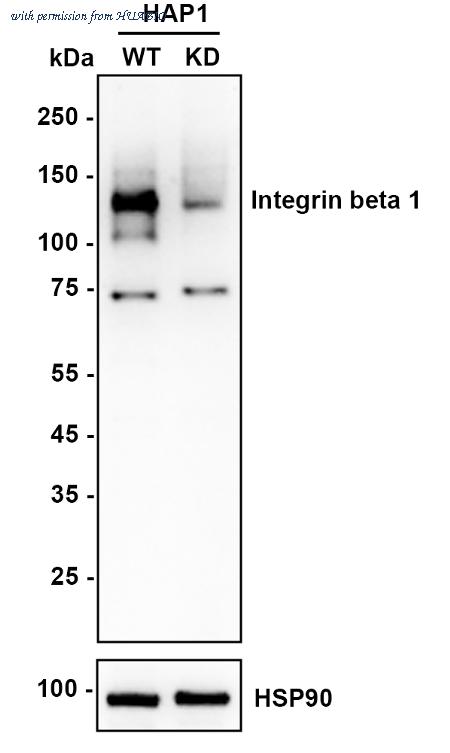 Western blot analysis of Integrin beta 1 on different lysates with Rabbit anti-Integrin beta 1 antibody (HA750008) at 1/5,000 dilution. Lane 1: HAP1-parental cell lysate Lane 2: HAP1-Integrin beta 1 KD cell lysate Lysates/proteins at 10 µg/Lane. Predicted band size: 88 kDa Observed band size: 120-140 kDa Exposure time: 18 seconds; ECL: K1801; 4-20% SDS-PAGE gel. Proteins were transferred to a PVDF membrane and blocked with 5% NFDM/TBST for 1 hour at room temperature. The primary antibody (HA750008) at 1/5,000 dilution was used in primary antibody dilution (K1803) at 4℃ overnight. Goat Anti-Rabbit IgG - HRP Secondary Antibody (HA1001) at 1/50,000 dilution was used for 1 hour at room temperature.