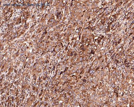 Immunohistochemical analysis of paraffin-embedded human liver carcinoma tissue with Rabbit anti-Integrin beta 1 antibody (ER31001) at 1/1,000 dilution. The section was pre-treated using heat mediated antigen retrieval with Tris-EDTA buffer (pH 9.0) for 20 minutes. The tissues were blocked in 1% BSA for 20 minutes at room temperature, washed with ddH2O and PBS, and then probed with the primary antibody (ER31001) at 1/1,000 dilution for 1 hour at room temperature. The detection was performed using an HRP conjugated compact polymer system. DAB was used as the chromogen. Tissues were counterstained with hematoxylin and mounted with DPX.