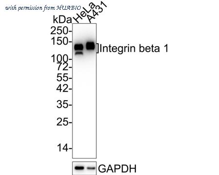 Western blot analysis of Integrin beta 1 on different lysates with Rabbit anti-Integrin beta 1 antibody (ET1602-10) at 1/5,000 dilution. Lane 1: HeLa cell lysate Lane 2: A431 cell lysate Lysates/proteins at 15 µg/Lane. Predicted band size: 88 kDa Observed band size: 120-140 kDa Exposure time: 43 seconds; ECL: K1801; 4-20% SDS-PAGE gel. Proteins were transferred to a PVDF membrane and blocked with 5% NFDM/TBST for 1 hour at room temperature. The primary antibody (ET1602-10) at 1/5,000 dilution was used in 5% NFDM/TBST at 4℃ overnight. Goat Anti-Rabbit IgG - HRP Secondary Antibody (HA1001) at 1/50,000 dilution was used for 1 hour at room temperature.