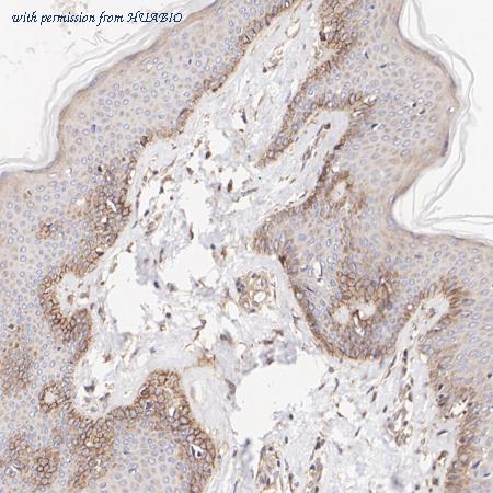 Immunohistochemical analysis of paraffin-embedded human skin tissue with Rabbit anti-Integrin beta 1 antibody (ET1602-10) at 1/1,000 dilution. The section was pre-treated using heat mediated antigen retrieval with Tris-EDTA buffer (pH 9.0) for 20 minutes. The tissues were blocked in 1% BSA for 20 minutes at room temperature, washed with ddH2O and PBS, and then probed with the primary antibody (ET1602-10) at 1/1,000 dilution for 1 hour at room temperature. The detection was performed using an HRP conjugated compact polymer system. DAB was used as the chromogen. Tissues were counterstained with hematoxylin and mounted with DPX.