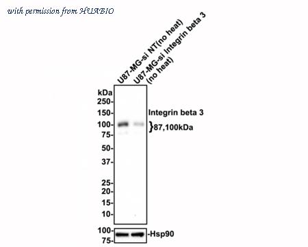 Western blot analysis of Integrin beta 3 on different lysates with Rabbit anti-Integrin beta 3 antibody (ET1606-49) at 1/500 dilution. Lane 1: U87-MG-si NT cell lysate Lane 2: U87-MG-si Integrin beta 3 cell lysate Lysates/proteins at 10 µg/Lane. Predicted band size: 87 kDa Observed band size: 87,100 kDa Exposure time: 1 minutes 10 seconds; 4-20% SDS-PAGE gel. ET1606-49 was shown to specifically react with Integrin beta 3 in U87-MG-si NT cells. Weakened band was observed when U87-MG-si Integrin beta 3 sample was tested. U87-MG-si NT and U87-MG-si Integrin beta 3 samples were subjected to SDS-PAGE. Proteins were transferred to a PVDF membrane and blocked with 5% NFDM in TBST for 1 hour at room temperature. The primary antibody (ET1606-49, 1/500) and Loading control antibody (Rabbit anti-Hsp90, ET1605-56, 1/10,000) were used in 5% BSA at room temperature for 2 hours. Goat Anti-rabbit IgG-HRP Secondary Antibody (HA1001) at 1:200,000 dilution was used for 1 hour at room temperature.